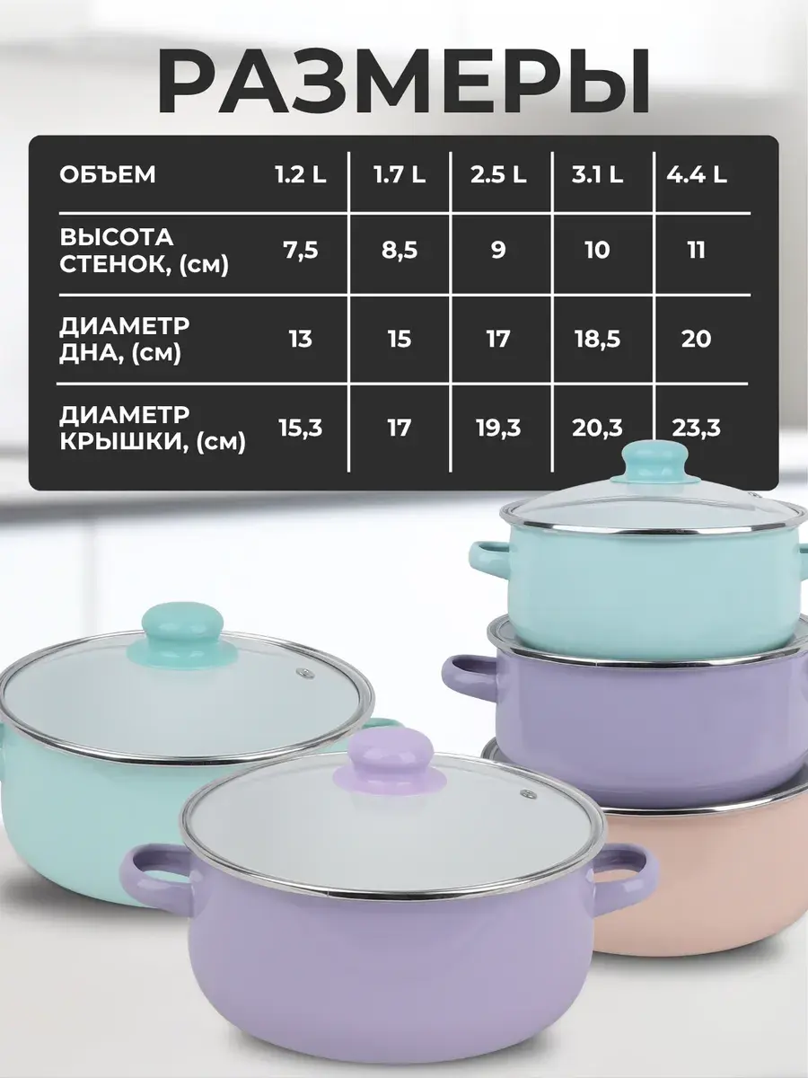 В набор входит посуда разного объема: 1,2 л., 1.7 л., 2,5 л., 3,1 л., и 4,4 л., что позволяет готовить блюда любого размера. Каждая кастрюля оснащена крышкой с пароотводом, что делает приготовление блюд еще более комфортным. Эмаль обеспечивает равномерный нагрев пищи и простоту ухода: посуду можно мыть вручную или использовать в посудомоечной машине.