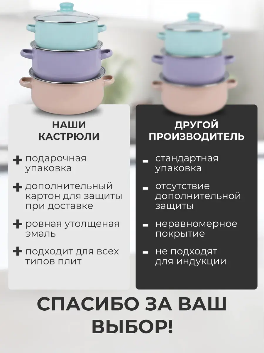Благодаря качественному эмалированному покрытию эта посуда прослужит долгое время даже при активном использовании. Функциональные крышки плотно прилегают к поверхности кастрюль и помогают сохранить тепло готового блюда дольше обычного времени.