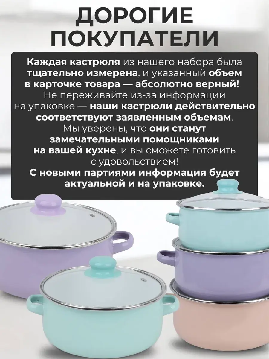 В набор входит посуда разного объема: 1 л, 1.5 л, 2 л, 2.5 л и 3 л, что позволяет готовить блюда любого размера. Каждая кастрюля оснащена крышкой с пароотводом, что делает приготовление блюд еще более комфортным. Эмаль обеспечивает равномерный нагрев пищи и простоту ухода: посуду можно мыть вручную или использовать в посудомоечной машине.