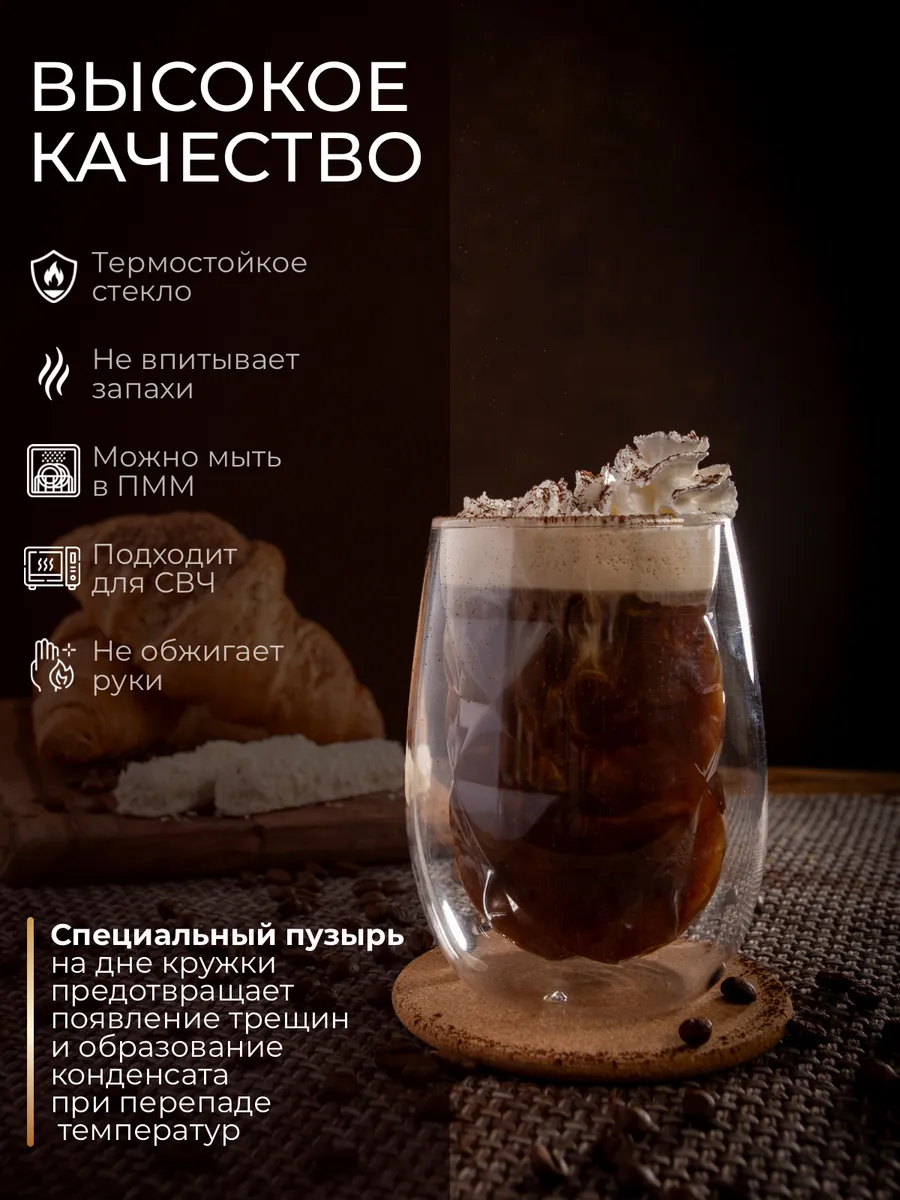 Благодаря изящному дизайну и прозрачному стеклу, этот аксессуар гармонично впишется в любую обстановку. Двойные стенки и дно обеспечивают прочность, долговечность и отличную термоизоляцию: напитки дольше сохраняют нужную температуру, а сама кружка не впитывает посторонние запахи. Особый пузырёк на дне добавляет оригинальности и помогает дольше удерживать тепло.