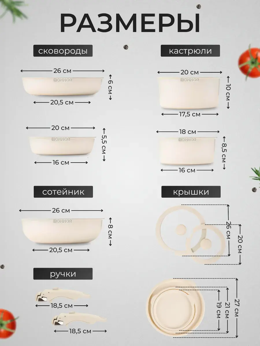 Комплектация: Сковорода 20 см (D) × 5,5 см H, Сковорода 26 см (D) × 6 см H, Чаша-кастрюля 2 л (18 см D × 9 см H), Чаша-кастрюля 2,,5 л (20 см D × 10 см H), Сотейник 3.5 л (26 см D × 8 см H). Аксессуары: 2 универсальные стеклянные крышки, 3 пластиковые крышки для холодильника, 2 съемные ручки, 5 подставок под горячее.