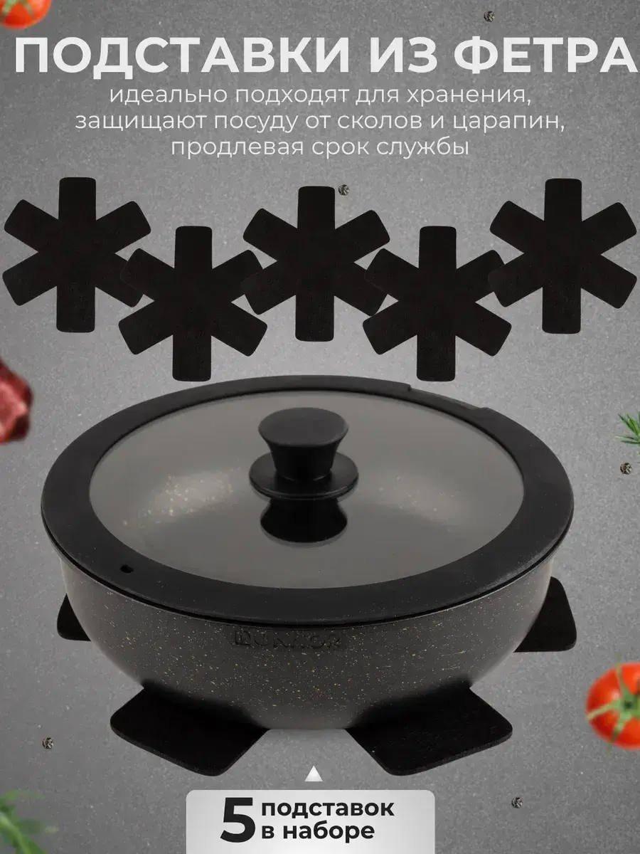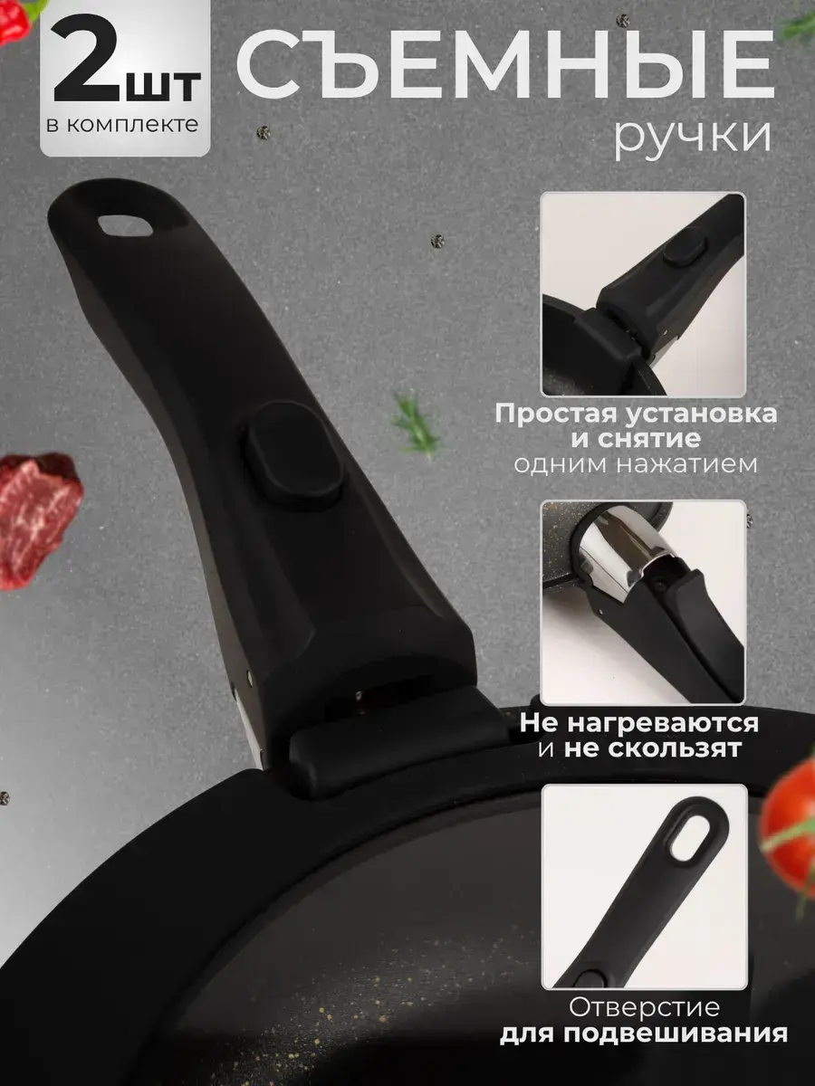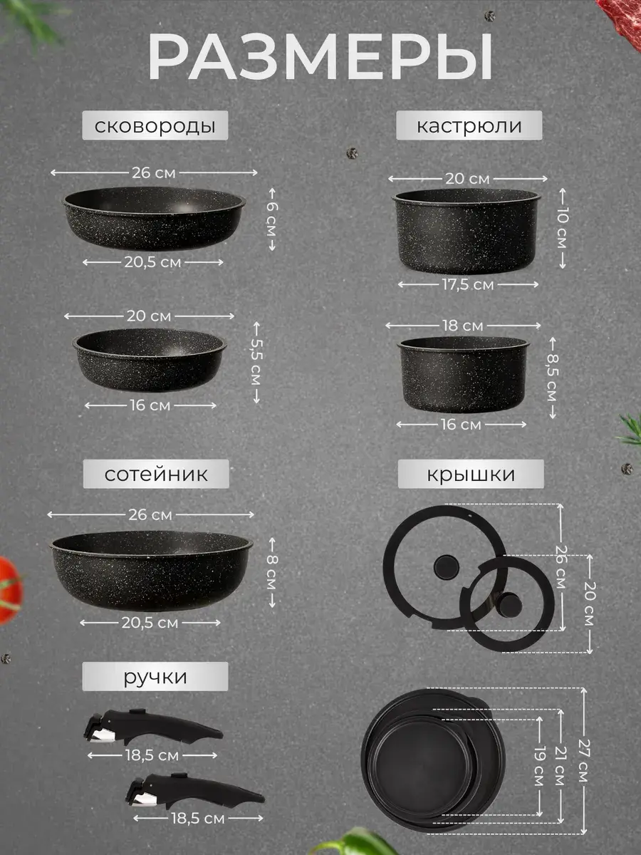 Набор отличается толстым дном, обеспечивающим равномерный нагрев без деформации. Уникальные крышки 2-в-1 сочетают жаропрочное стекло для контроля приготовления и плоские пластиковые крышки для удобного хранения. Съемные ручки позволяют компактно хранить посуду и использовать ее в духовке. Универсальность набора подтверждается возможностью использования на любых плитах, включая индукционные. Элегантный дизайн с матовым черным покрытием и плавными линиями делает посуду стильным украшением кухни.