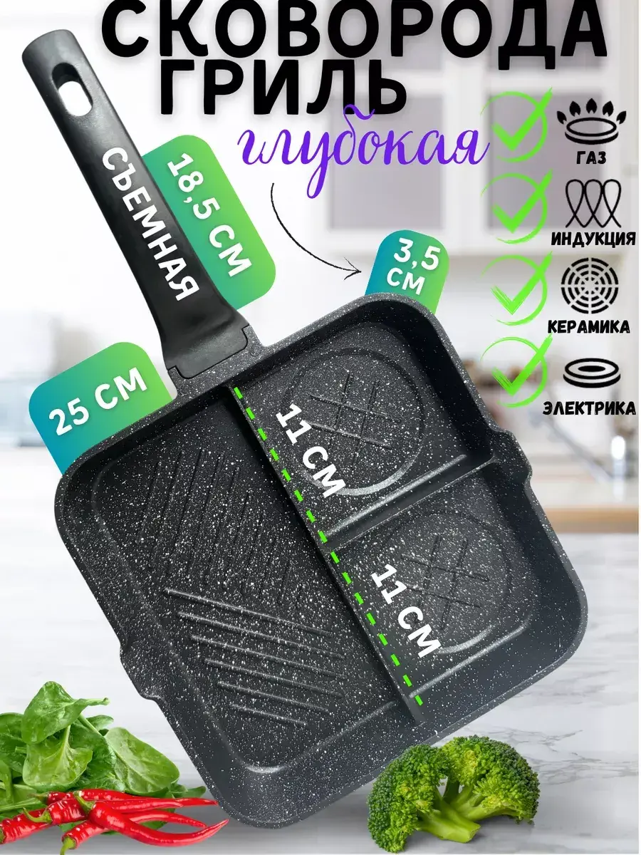 Квадратная форма сковороды с ячейками размером 11х11 см. и отсеком для гриля размером 11х22 см. подходит для всех видов плит, включая индукционные. Антипригарная поверхность обеспечивает легкую очистку и комфортное использование.