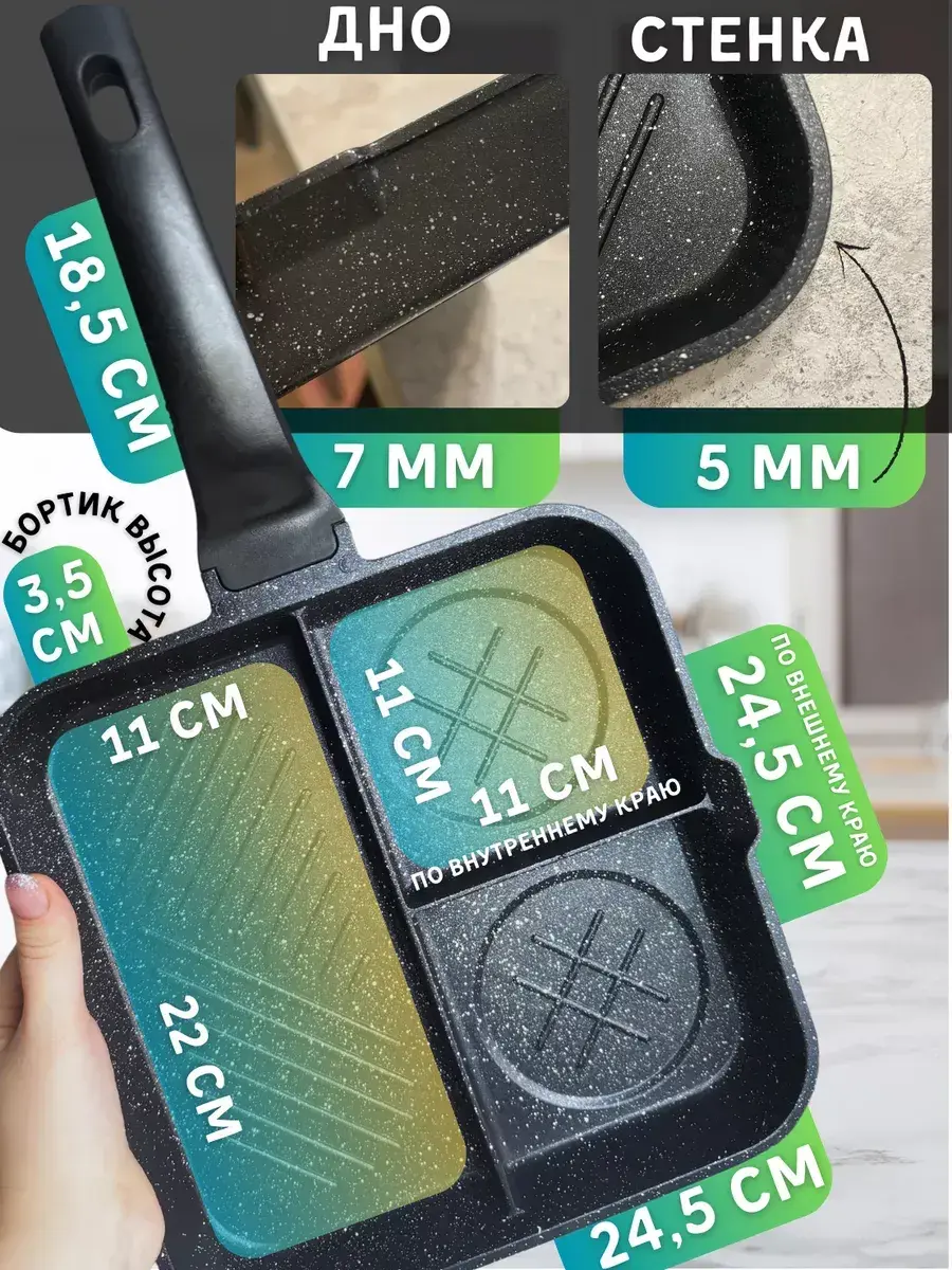 Уникальная сковорода-гриль – это идеальное решение для приготовления вкусных блюд на завтрак. Утолщенная поверхность сплошного дна обеспечивает равномерный нагрев всех секций, так что вы можете быть уверены, что ваше блюдо будет готово идеально. С высотой бортиков в 3,5 см. вы можете безопасно приготовить любое блюдо, даже при использовании высоких температур.