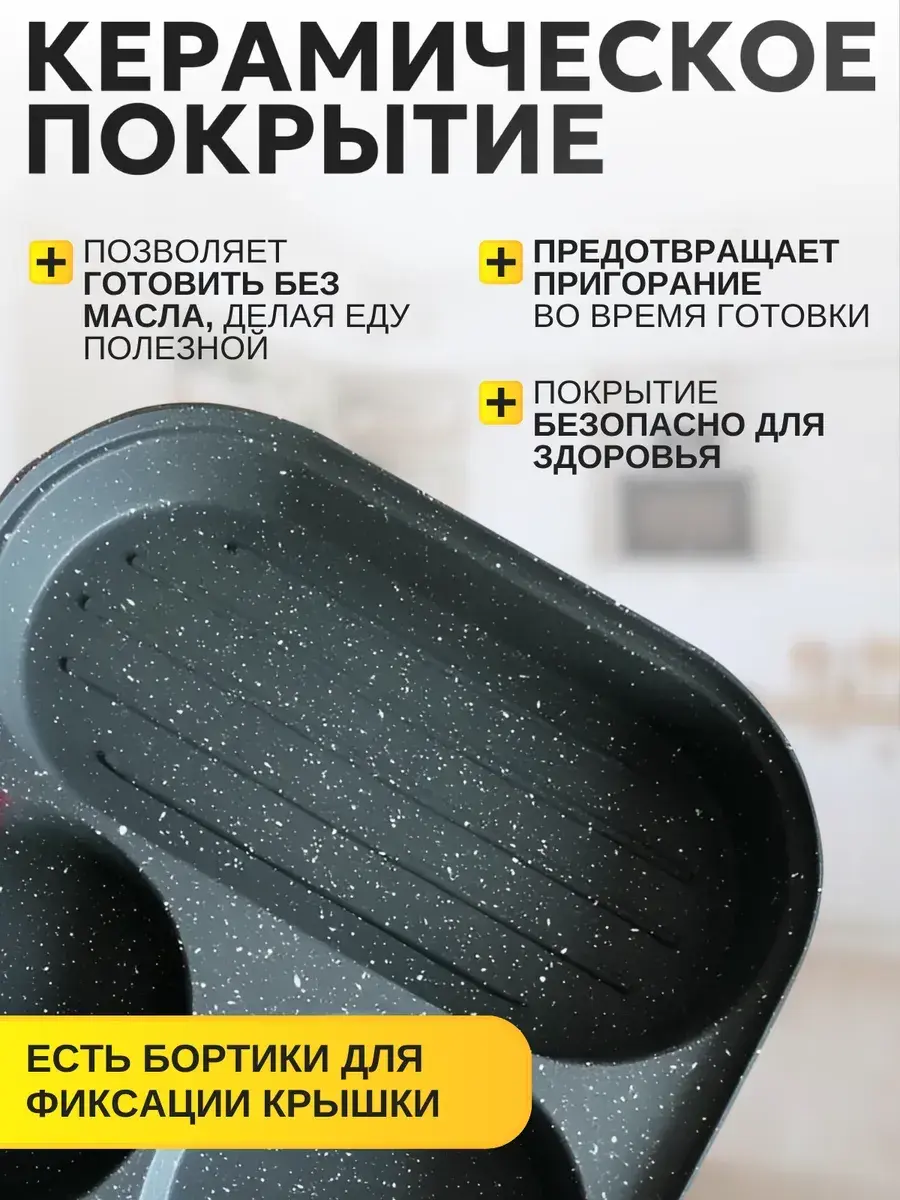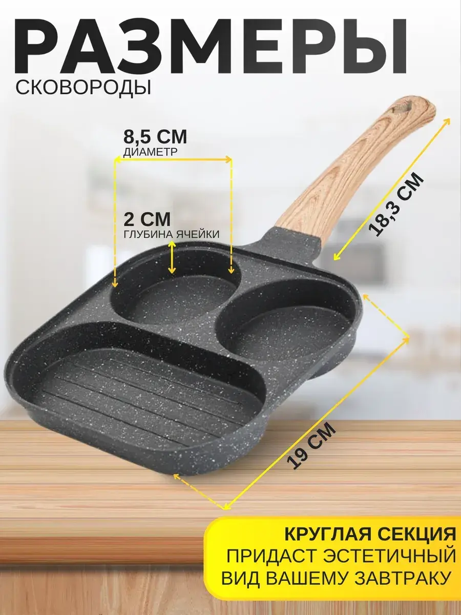 Секционная конструкция – главное преимущество: готовьте яичницу, бекон и оладьи одновременно на одной сковороде, экономя время и сокращая количество мытья посуды. Эта сковорода станет вашим незаменимым помощником для создания аппетитных завтраков каждый день. Ее стильный и функциональный дизайн делает ее также отличным подарком для мамы, бабушки, сестры или жены на любой праздник.